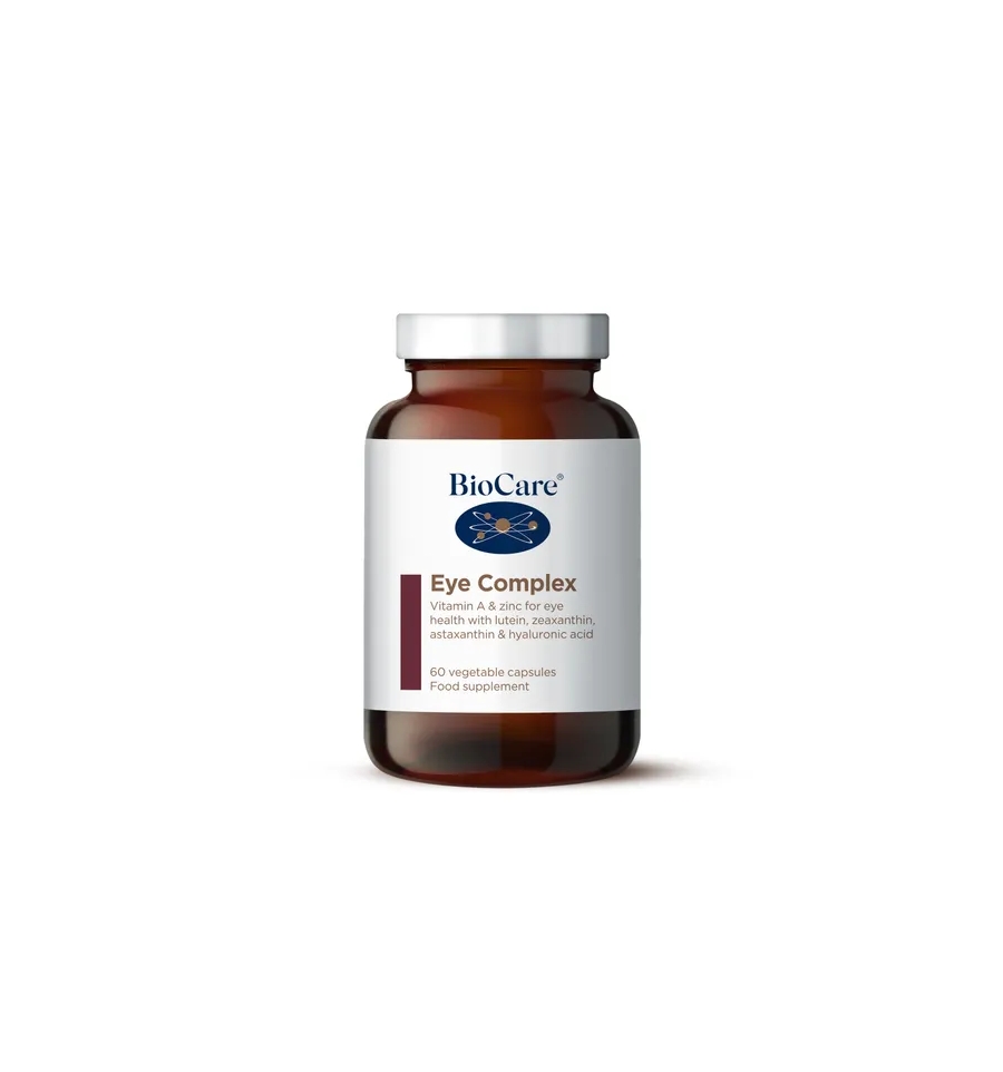 Nutrient complex with vitamins A and E, zinc, copper, lutein, astaxanthin and meso-zeaxanthin, bilberry, hyaluronic acid and L-taurine designed to support eye health