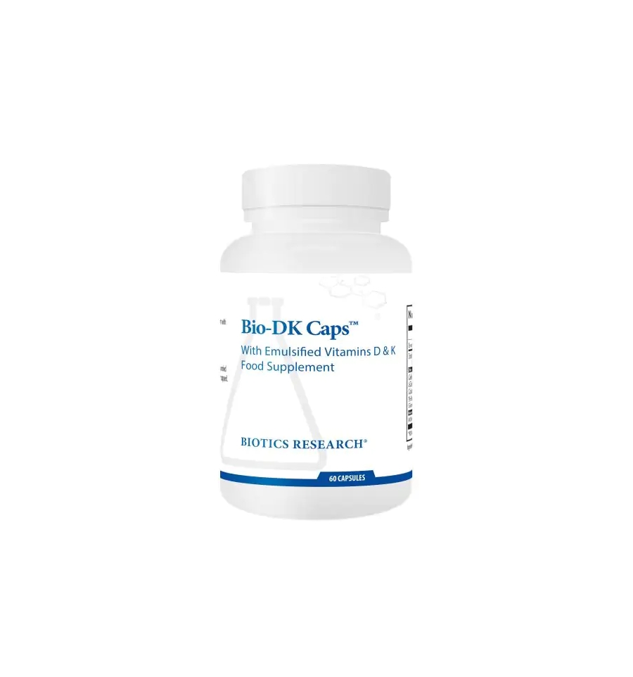 Bio-DK Caps™ supplies 125 mcg (5,000 IU) of vitamin D3, 550 mcg of vitamin K (as K1 phytonadione and K2 menaquinone-7) as a micro-emulsion for enhanced absorption and use, which is particularly important for those with malabsorption conditions.