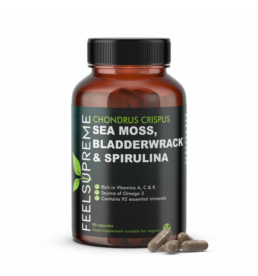 Marine superfoods Irish Sea Moss and Bladderwack with added Spirulina are specially formulated to promote overall health and wellness providing a comprehensive range of nutrients.