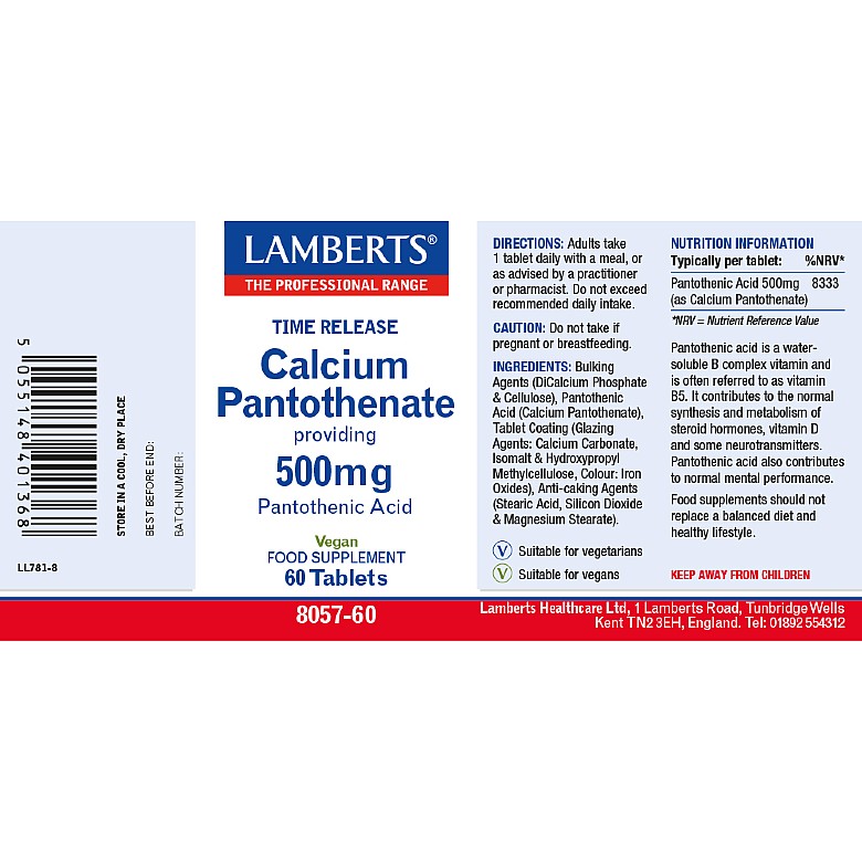 Calcium Pantothenate 500mg – Vitamin B5 (Pantothenic Acid) – 60 Time Release Tablets – Lamberts®