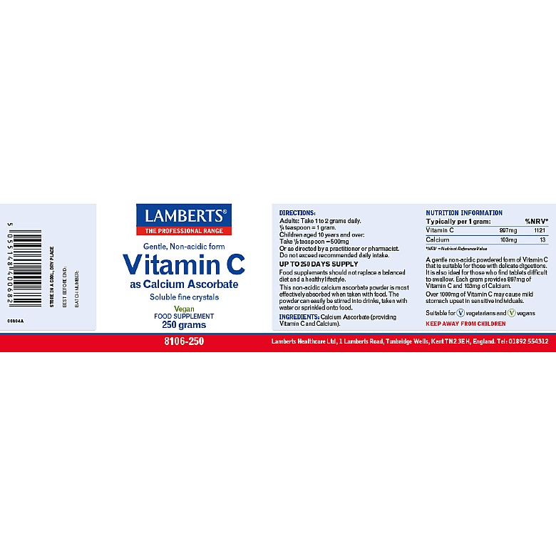 A gentle non-acidic form of vitamin C. Soluble fine crystals that can be easily added to drinks or sprinkled on to foods. Each gram provides almost 900mg of vitamin C plus just over 100mg of calcium. Suitable for those with intestinal problems due to its gentle action